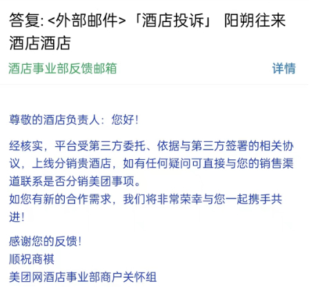 因酒店没有和美团合作,当消费者通过美团平台预定该酒店房客产品后,酒店并不会收到来自美团平台的预订信息。“客人到了酒店之后查不到预订,会把气撒到酒店身上,这对酒店和客人来说都很无辜。”