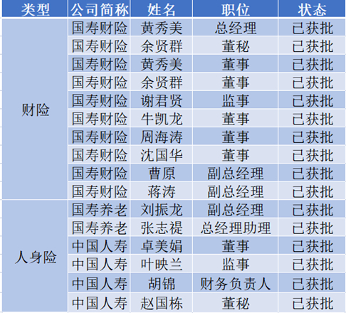 天眼查数据显示,由中国人寿保险(集团)公司和中国人寿保险股份有限公司共同出资设立的国寿资产原总裁王军辉,调任国寿养老党委书记、拟任董事长,国寿资产副总裁于泳现任公司临时负责人。除此之外,国寿集团旗下三大主要子公司另有14位董监高发生变动,今年2月,余贤群同时获批了国寿财险董事、董秘两个职位任职资格。同月,黄秀美总经理、董事任职资格获批。