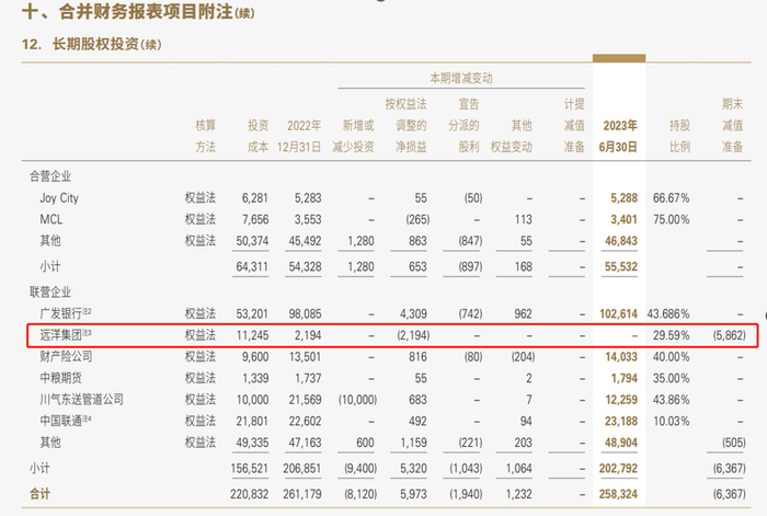 财报数据显示,中国人寿在远洋集团提供的截至2023年6月30日止6个月期间的利润表和所有者权益变动表的基础上进行权益法调整,2023年1-6月权益法调整金额为-21.94亿元,截至2023年6月30日止本集团持有的远洋集团的长期股权投资账面价值为0,期末减值准备为-58.62亿元。远洋集团初始投资成本112.45亿直接“清零”。