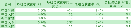 据中报数据显示,中国人保、中国人寿、中国太保、新华保险、中国平安五大A股保险企业实现净投资收益分别为4.4%、3.78%、2%、3.4%和3.5%,同比变动-0.2、-0.37、-0.1、-1.2和-0.4个百分点,全部出现下滑。其中,中国人寿和中国平安下滑相对严重,接近0.4个百分点。