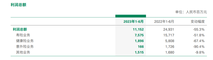 具体来看,寿险业务、健康险业务、意外险业务、其他业务利润总额均呈下降态势。中国人寿2023年上半年实现利润总额超111.52亿元,同比下降55.3%。其中,寿险业务利润总额为75.75亿元,同比下降51.8%;健康险业务利润总额为18.96亿元,同比下降67.4%;意外险业务利润总额为1.66亿元,同比下降90.4%;其他业务利润总额为15.15亿元,同比下降9.8%。