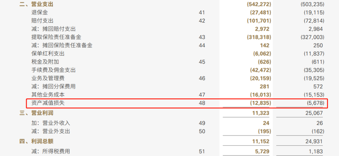 通过观察营业支出数据可发现,公司2023年上半年产生资产减值损失128.35亿元,与2022年同期资产减值损失56.78亿元相比上升71.57亿元同比变动126.05%,对盈利造成了一定的压力。