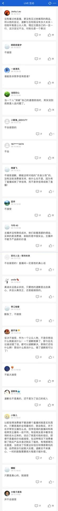 在我们的大蓝鲸节目互动专区,只有少数的网友愿意接受李佳琦的道歉,而绝大多数网友都态度坚决地选择了不接受道歉,还有网友从李佳琦引发的风波背后,看到了直播带货中存在的许多问题。