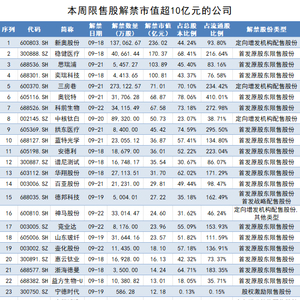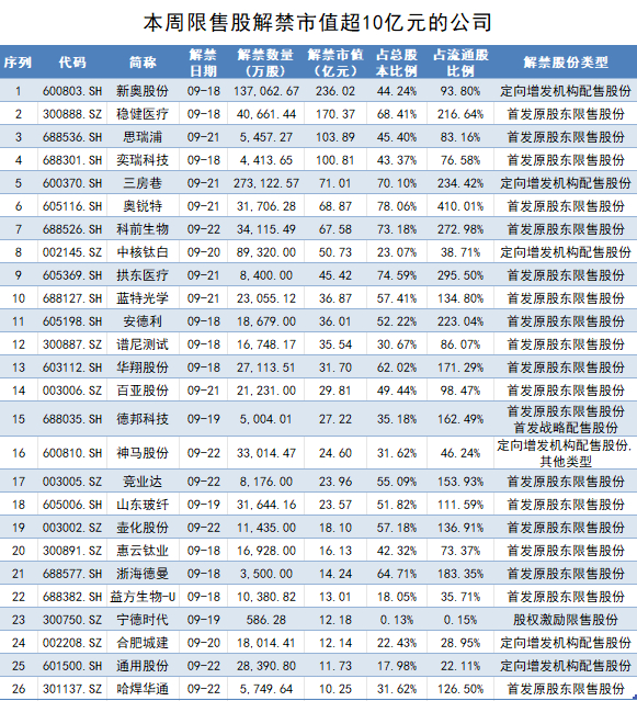 本周解禁市值超过10亿元的公司有26家,新奥股份(600803.SH)、稳健医疗(300888.SZ)、思瑞浦(688536.SH)、奕瑞科技(688301.SH)等四家公司解禁市值超100亿元。三房巷(600370.SH)、奥锐特(605116.SH)、科前生物(688526.SH)、中核钛白(002145.SZ)等四家公司也各有超过50亿元的解禁规模。