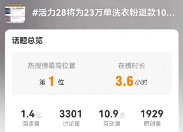 9月17日晚,“活力28将为23万单洗衣粉退款10元“冲上热搜第一。