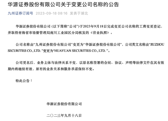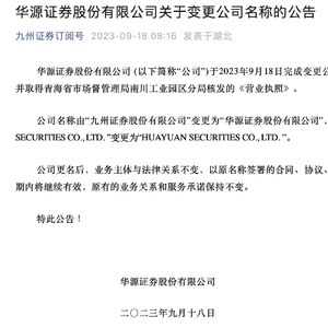 9月18日早间,九州证券官方微信公众号宣布,公司于2023年9月18日完成变更公司名称的工商变更登记,公司名称由“九州证券股份有限公司”变更为“华源证券股份有限公司”。