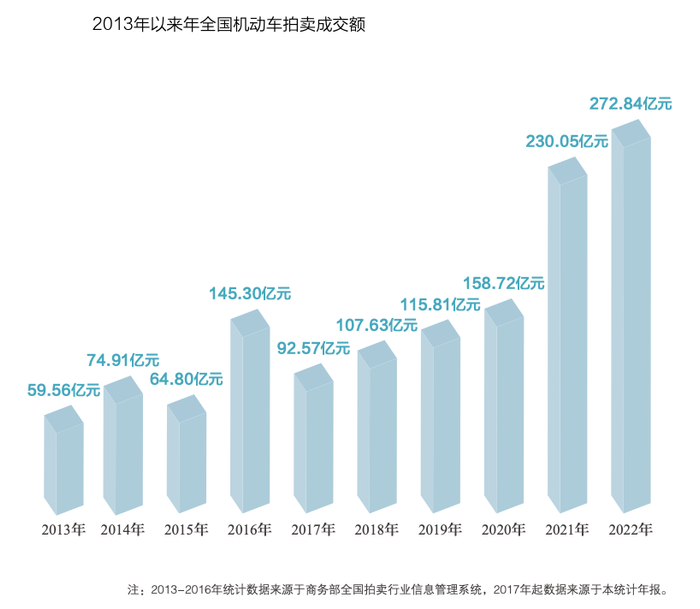 中国拍卖行业协会副会长兼机动车拍卖专业委员会主任韩涛介绍称,从罚没车辆拍卖,到公车拍卖,再到社会车辆拍卖,以及电商平台网络拍卖的兴起,在2013~2022年的十年间,我国机动车拍卖场次从全年1.2万场增至5.95万场;成交额从59.56亿元跃升至272.84亿元;拍卖委托源从完全倚重于政府、司法机构转变为社会化机构占据90%以上;专业从事机动车拍卖的企业从凤毛麟角、小而散发展壮大至389家,相关从业人员达3500余人。