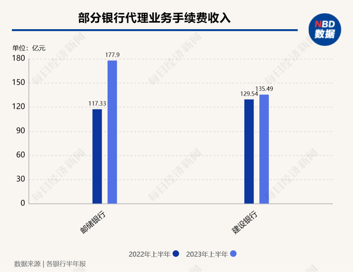 具体来看,上半年,邮储银行代理业务手续费收入177.9亿元,同比增长51.62%,主要是代理保险等业务收入实现快速增长;建设银行代理业务手续费收入135.49亿元,较上年同期增加5.95亿元,增幅4.59%,主要是代理保险强化客户资产配置、推动期缴转型,带动收入快速增长。