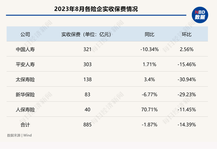 其中,8月单月,各公司保费收入增速较此前3个月的高速增长画风明显不同。数据显示,8月,中国人寿、平安人寿、太保寿险、新华保险、人保寿险5家寿险公司合计实现保费收入885亿元,同比下降1.87%,环比下降14.39%。