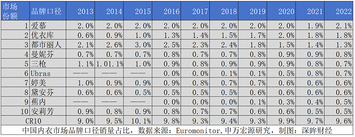 从上表中可以看到,传统品牌的市场份额,大部分都在逐年下滑。都市丽人从2015年市占率3%一路下跌到2022年1.3%,爱慕虽然稳定,但是后来者“内衣三姐妹”的市占率却是在2016年之后,增速加快。
