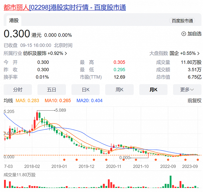 资本市场对这份成绩不买单,自业绩公布后,都市丽人股价一路下跌,最新股价为0.3港元/每股,因此港股市场一度称其为“仙股”。