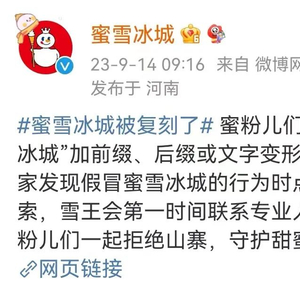 9月14日,蜜雪冰城官微发文打假,称“蜜雪冰城”加前缀、后缀或文字变形都是假冒门店,还附上了举报链接,呼吁大家一起打假。