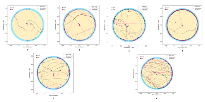 那么,就依照这只AI的判断,来指挥电极向停下的蟑螂发出刺激吧。科学家把每一只植入了电极的蟑螂放进一个圆形运动场,当AI认为它没有走动,它的尾须就会受到电刺激。蟑螂每次要在圆形运动场里待7分钟,这是科学家留给它探索运动场的时间。时间结束之后,研究者会评估它探索了多少:比如搜索了多大区域(以网格数计算),行走了多长的距离,有多少时间在行走等等。然后,和没有施加电刺激时的7分钟探索程度做对比。