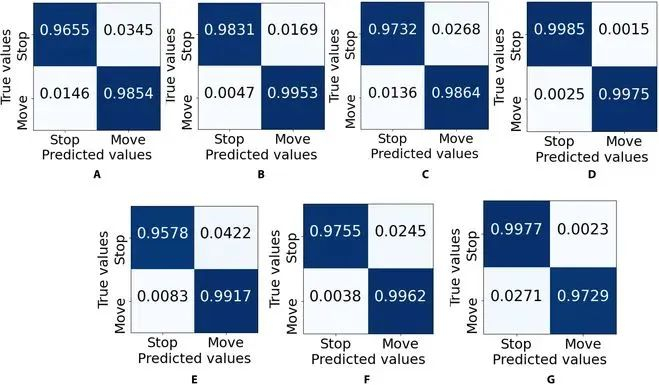 但对追求准确的研究者来说,只靠IMU还不足以确定蟑螂的运动状态,因为它会有偏差和噪声。所以,科学家要用机器学习算法来分析IMU数据,更好地判断蟑螂有没有停下脚步。他们训练了几种不同的AI,包括支持向量机(SVM),K近邻算法(KNN)、逻辑回归(LR)和朴素贝叶斯(NB),看哪种方法的准确度最高。