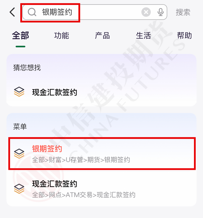 第二步:在上方搜索框中输入并搜索“银期签约”,然后点击“银期签约”。