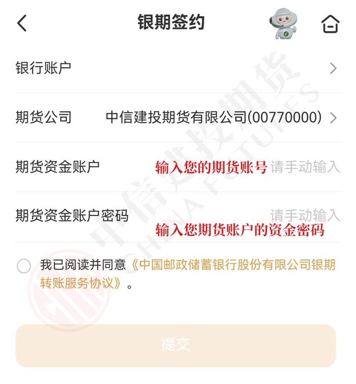 第四步:选择您的邮储银行账户并填写基本资料,期货公司选择“中信建投期货有限公司”,输入期货账号和您期货账户的资金密码并提交,最后等待银行审核通过即可完成银期签约。