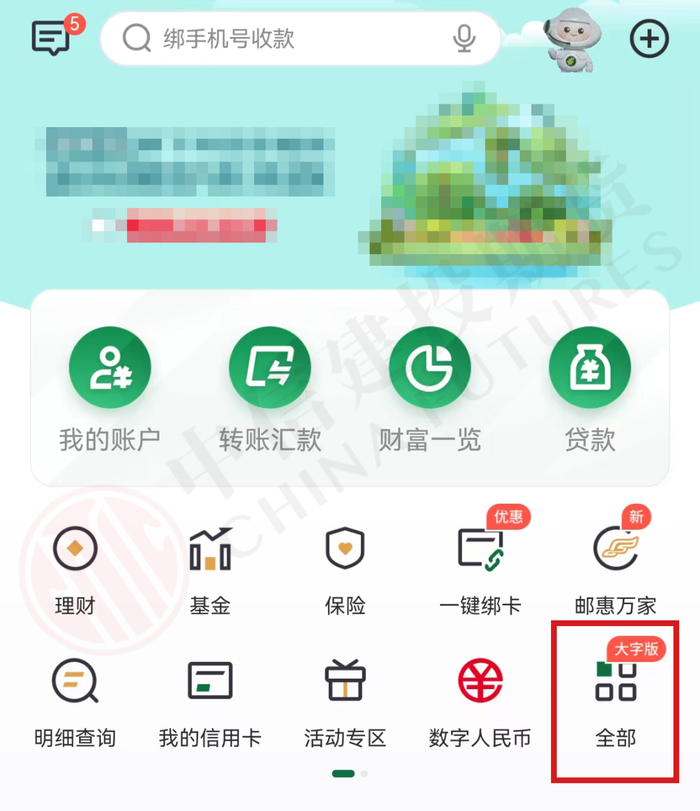 第一步:打开并登录中国邮政储蓄银行的手机银行APP(邮储银行),在首页点击“全部”。