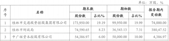 截至2022年末,桂林银行的前三大股东分别是,桂林市交通投资控股集团有限公司(以下简称“桂林交通投资”)、桂林市财政局、中广核资本控股有限公司(以下简称“中广核资本”),持股比例分别为19.19%、8.23%、6%,前10大股东合计占比达到55.73%。