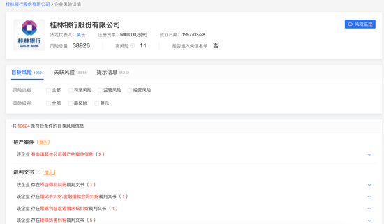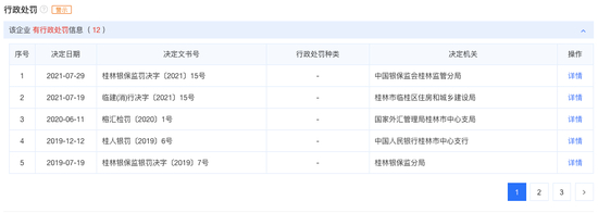 另据爱企查显示,桂林银行自身风险有1.96万个,关联风险1.88万个,行政处罚信息12个。其中,2019年12月2日,因假币收缴不合规、超期处理征信异议,桂林银行被处以7万元罚款的行政处罚。2020年6月11日,桂林银行因未按照规定报送财务会计报告、统计报表等资料,被国家外汇管理局桂林市中心支局予以警告、处以人民币5万元的罚款,并责令改正。