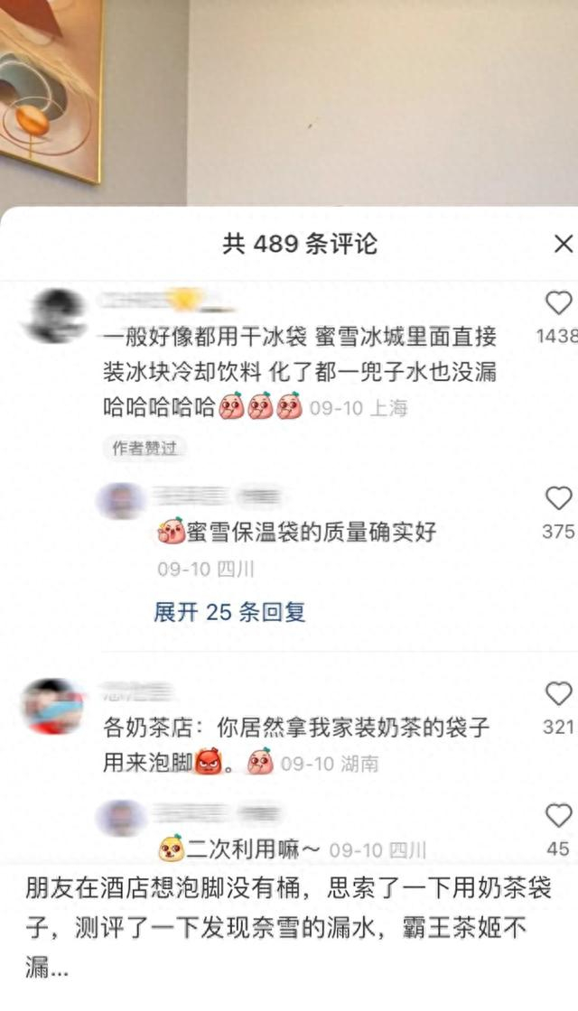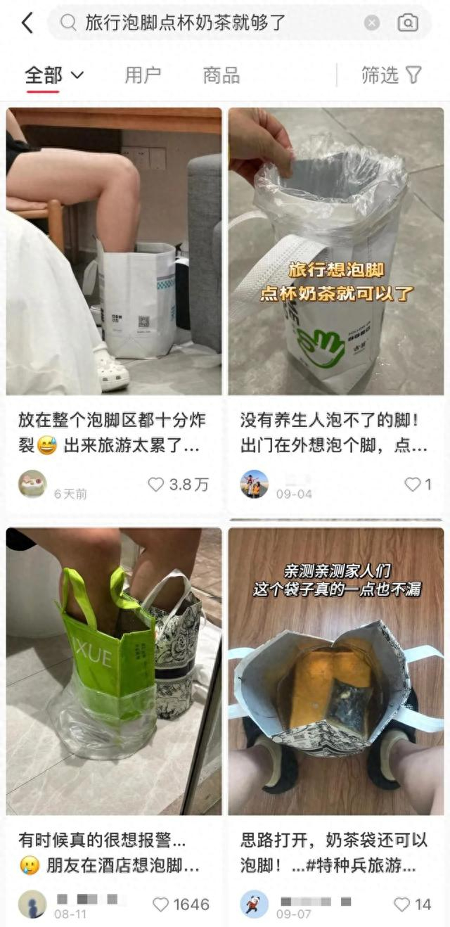 前几天,#旅行泡脚,点杯奶茶就够了#登上小红书热搜,收获了近千万的讨论热度。该话题的热门内容里,网友们晒出用各式奶茶打包袋泡脚的照片,画风清奇,更有网友表示,“这放在整个泡脚区都十分炸裂”。