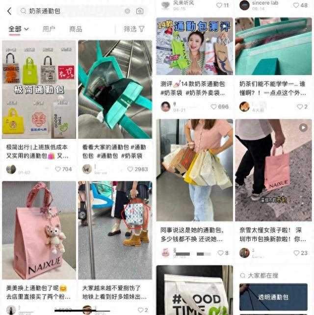 近年来,社交平台上更是刮起“奶茶通勤包”风,“一周五色不重样”“明天背什么新款,取决于公司下午茶喝什么”,现实生活中年轻人们拎着各式奶茶打包袋穿梭在马路、地铁站、写字楼的身影也随处可见。在一些城市,奶茶袋甚至风靡到被封为新一代“市包”并登上热搜。
