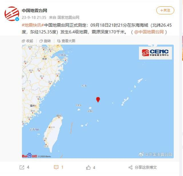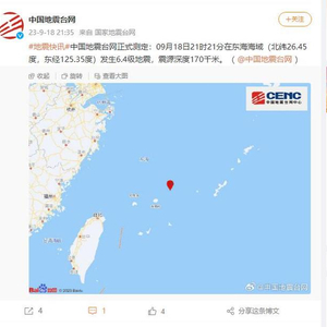 中国地震台网正式测定:09月18日21时21分在东海海域(北纬26.45度,东经125.35度)发生6.4级地震,震源深度170千米。