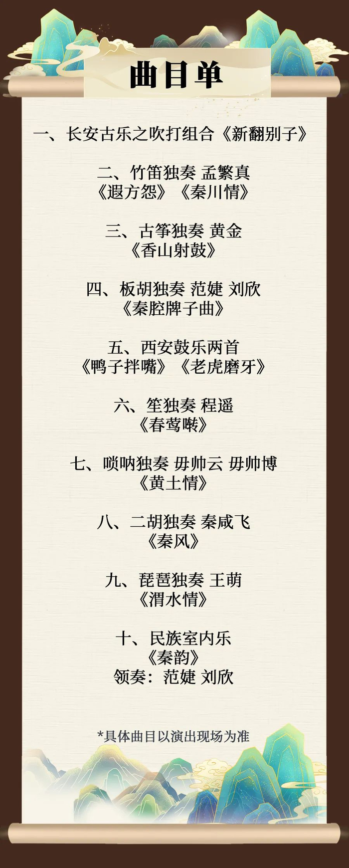 在这场音乐会中,陕西省歌舞剧院民族乐团室内乐组合将为秦韵古曲赋予时代新意,《秦腔牌子曲》行云流水地展示出浓浓的秦风秦韵,《黄土情》兼具传统陕西音乐风格和现代演奏技法,《春莺啭》复原唐代教坊大曲,重现盛世浮华。传统经典名曲带领听众在音乐中穿梭千年,重遇长安。
