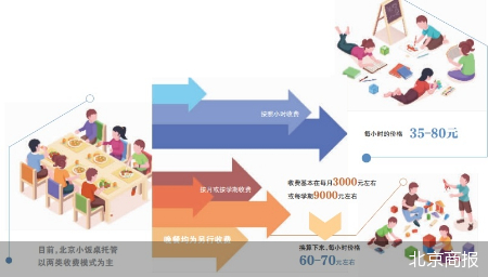 北京商报记者给这些小饭桌机构算了一笔账,目前,北京小饭桌托管以两类收费模式为主。一类按照小时收费,每小时的价格为35-80元不等;另一类按月或按学期收费,收费基本在每月3000元左右或每学期9000元左右,换算下来,每小时价格在60-70元左右。晚餐均为另行收费。以上述交道口附近的托管机构为例,仅考虑房租一项成本,每月也需保持34名以上学生在托才可覆盖房租成本。