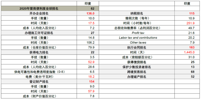 在印度,流程复杂和法律执行力较低制约了营商环境。印度在金融信贷支持、保护少数投资者方面条件相对较好,但涉及到开设企业、登记财产等环节则办理时间较长、成本较高,尤其合同执行效率较低。2021年印度政府的文件显示,受营商环境制约,2014年以来有近3000家外国企业关闭了在印度的业务[5]。