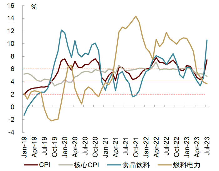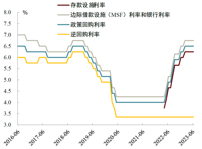 2023年4月以来,印度央行保持货币政策“按兵不动”,将流动性调整工具(LAF)下的政策回购利率维持在6.5%;存款设施(SDF)利率维持在6.25%;边际借款设施(MSF)利率和银行利率保持在6.75%[61]。自2022年5月以来,印度央行已经上调基准利率250个基点。向前看,由于印度目前通胀仍较高,在油价上升之下,印度7月通胀从6月的4.9%跳升值7.4%,且市场预期8月通胀仍将超过其2-6%的通胀目标[62],我们认为,短期内印度央行或继续将利率维持在目前较高水平。