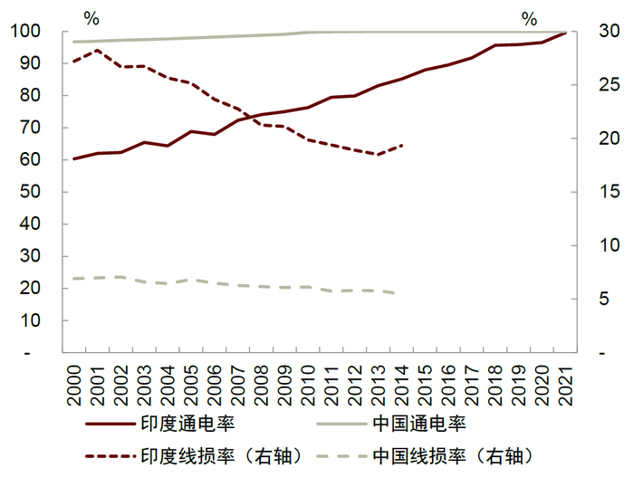 另一个问题是印度电力供应比较薄弱,虽然近年来通电率有明显提升,但线损率仍然很高。2021年人均电力消费量仅1025千瓦时/人,约为中国的1/5[3]。印度供电体制较复杂,由中央、邦和私人部门提供,其中私人部门贡献约一半电力装机,不同供电商各自为政[4]。