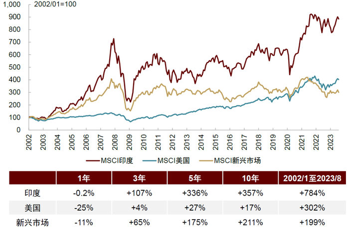 印度股市在新兴市场中表现强劲。从二十年区间来看,除2008年全球金融危机和2020年初新冠疫情爆发引发股指大幅下跌,其余时间印度股市均稳步增长。2002年至今MSCI印度指数涨幅+784%,显著领先MSCI新兴市场指数涨幅。