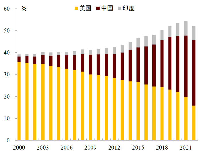 印度说英语的人数占比约10%[2],与境外交流比较便利。根据英孚英语测试,印度在英语熟练度方面的全球排名(52名),属于中等熟练程度。但印度人口潜力的发挥也存在一定制约,一是劳动参与率低,特别是女性。2021年印度25岁以上人口的劳动参与率仅52.5%,女性劳动参与率仅22.5%。根据世界银行数据,2022年印度劳动力有5.2亿人。缺乏就业岗位、就业市场规范程度较低等是印度劳动参与率较低的原因之一。此外,在就业形式中,印度非正式就业仍占主流。例如,城市就业市场正式雇员仅占一半,半数以上就业形式属于自雇或临时工。