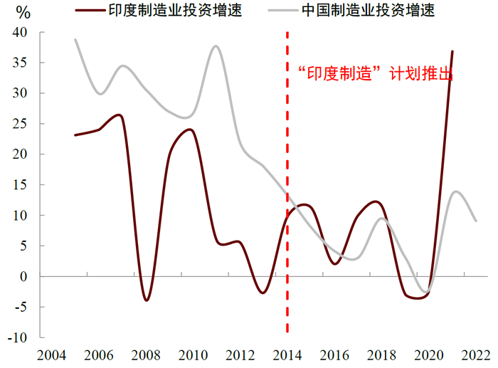 尽管服务业的蓬勃发展带动了印度的经济增长,但投资者十分关注印度在其人口优势之下未来制造业的发展前景。2014年9月莫迪政府提出了雄心勃勃的“印度制造”计划,但从过去几年的发展看,印度“制造强国”构想的整体进展相对较缓,不及此前提出的政策预期[24]。数据显示,2014-2020年印度制造业投资同比增速并没有特别大的提升,根据此前制定的“印度制造”目标,政府原本计划将印度制造业增加值占GDP比例从15%提升至2020年的25%,但这一目标已先后两次推迟至2022年、2025年[25]。