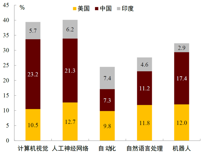 虽然印度是传统IT大国,但人工智能(AI)领域来看,印度发展动能仍相对落后。从整体AI领域发表论文数量来看,印度发表论文占比逐年上升,但仍低与中国、欧盟与英国、美国[12]。从高影响论文占比上看,印度近年也呈扩大趋势。美印近期宣布将在人工智能领域展开合作,或可能会使印度技术进步得到边际提升。