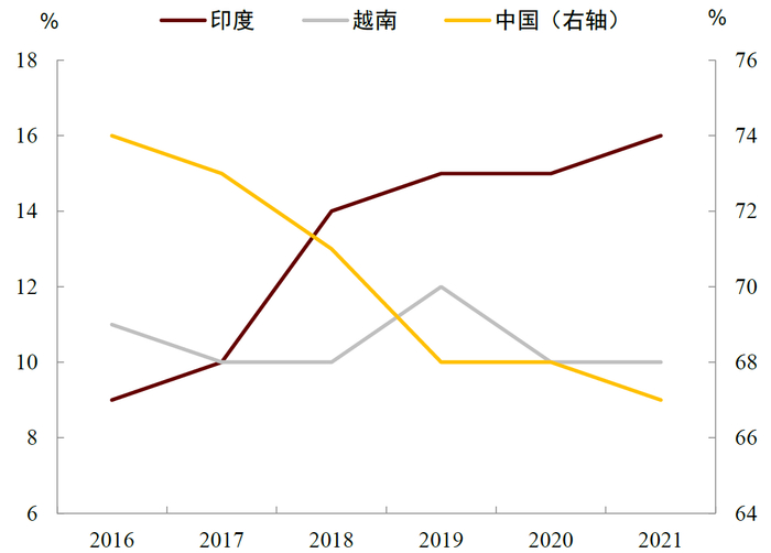 展望未来,印度或主要在成本驱动下,承接偏劳动密集型的缝制加工环节的转移。印度整体供应基础仍然相对薄弱,在附加值更高的纤维和纱线、面料等产业的国际竞争力不强,这使得其更多承接附加值较低的制衣环节。此外,随着出口份额向东南亚转移得越多,东南亚、南亚等国对中国纺织中间品的需求就越大,印度、越南约50%的纤维、纱线、面料仍需从中国进口,对中国纺织中间品的依赖程度大体呈抬升趋势,以中国和越南为代表的东南亚等国间形成了一种深度的嵌合关系[28]。