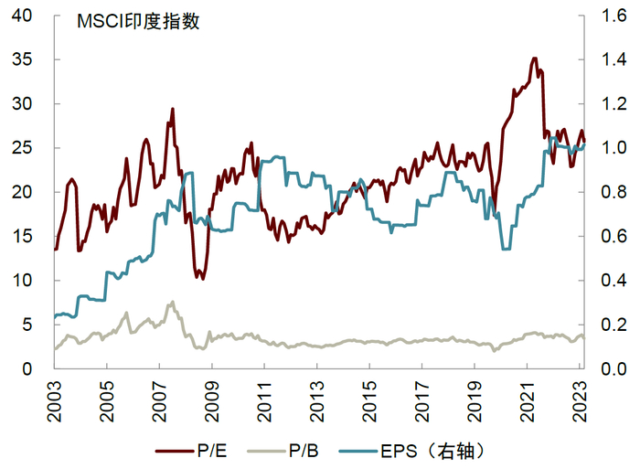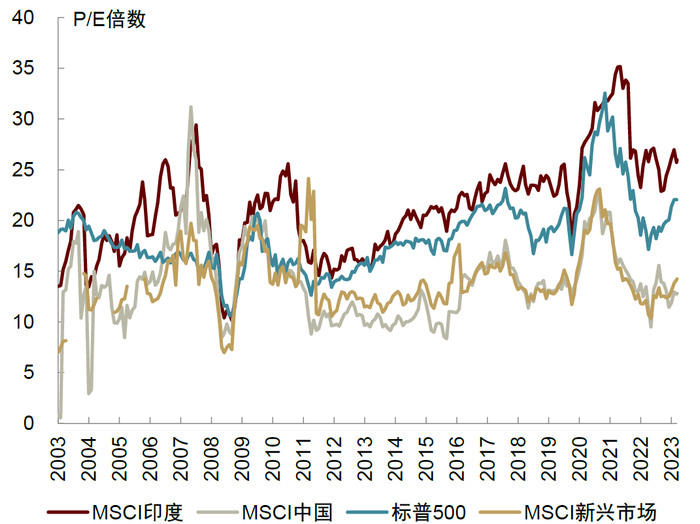 2023年8月底,MSCI印度指数的市盈率为25.7倍,相比2003年8月以来的历史中位数(21.3倍)和平均值(21.4倍)处于中等偏高水平。相比于其他新兴市场国家,印度股市估值高也意味着投资风险更高。