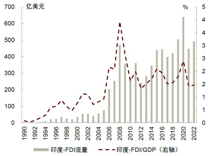 鉴于国内资本不足,印度从20世纪80-90年代以来一直在逐步开放和自由化资本流动。印度政府不断放宽外国投资限制、简化批准程序和提供更多的投资机会等一系列改革。近年来印度持续吸引国际资本流入,尤其是外商直接投资。从FDI占GDP的比例来看,印度FDI占GDP的比例从90年代至今不断上升,近年稳定维持在2%左右。