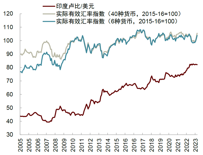 另一个困扰海外投资者的因素是汇率问题。2008年以来,印度卢比对美元的名义汇率持续贬值,平均每年贬值3%-4%,这使资本市场的升值或被名义汇率的贬值所抵消,对资本市场来说可能增大交易风险与成本。不过,印度卢比的名义贬值是经济运行的结果,印度国际收支长期失衡、经常项目处于逆差,原油自给率较低并依赖进口、油价波动对进口金额和贸易逆差的影响大。加之国内劳动参与率相对低,生产和供给较消费和需求短缺,通胀中枢较高。考虑到通胀调整与贸易权重,印度实际有效汇率在近些年相对稳定[79]。