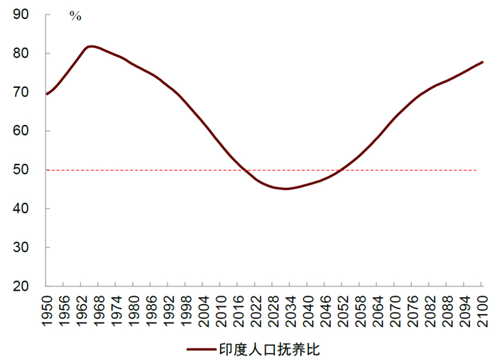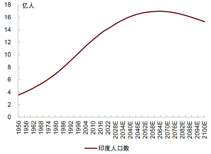 印度最主要的优势是人口。联合国预测今年印度成为世界第一人口大国,并且人口规模将继续增长。根据联合国预测,到2063年印度人口将达到接近17亿人的水平,至2100年印度占全球人口比例维持在15.3%,这意味着印度将在较长时间内保持人口规模优势。