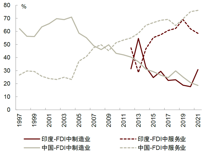 ► 二是经商环境不稳定,产业政策与监管不确定性较强[42][43]。印度很多外资企业在政策延续性与不确定性相对较强,外资更多愿意投资轻资产的服务业,不愿意投入重资产的制造业投资。