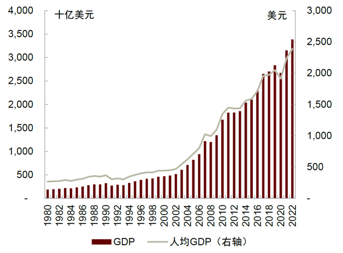 2022年,印度名义GDP总量为3.4万亿美元(参考世界银行数据),是全球第五大经济体,仅次于美国、中国、日本和德国。由于人口众多,印度人均GDP水平偏低,2022年为2389美元。2023年二季度,得益于服务业强劲复苏,印度实际GDP增速达到7.8%[1]。疫后印度经济增长表现不错,2021、2022年是G20国家中GDP增长最快的国家之一。