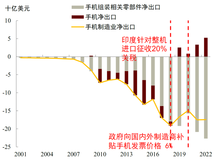 在政府补贴措施之下,印度消费电子行业蓬勃发展。以手机为例,近期印度手机制造业出口的显著增长引发关注,根本原因在于产业政策的强力扶持。2018年印度政府对整机进口征收20%关税带来整机进口大幅走低,其后2020年PLI计划针对在印度完成组装的手机补贴发票价格的6%[29],从而带来印度手机制造商大量进口手机零部件,并在印度完成组装,整机贸易差额转为顺差。