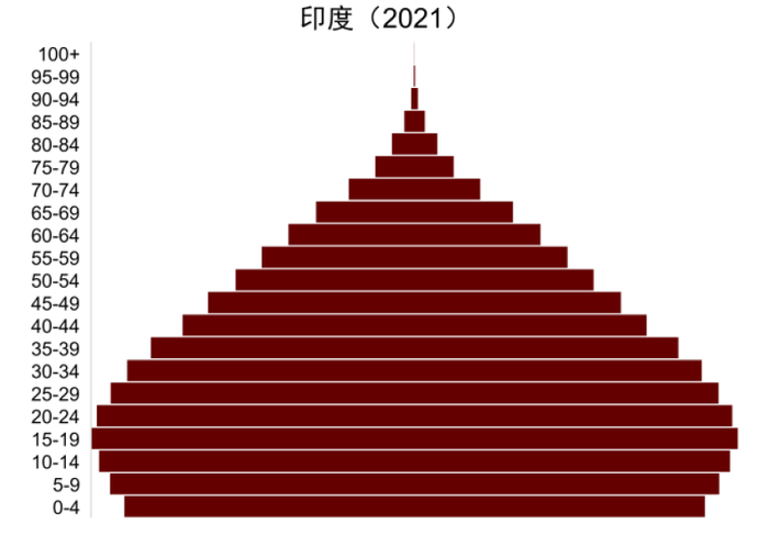 从人口年龄结构来看,印度年轻人口数量众多。人口抚养比是人口中受抚养人口与劳动年龄人口的比例,人口抚养比越低说明劳动年龄人口的抚养负担越轻。近几年来,印度人口抚养比持续改善。人口金字塔的形状也体现了印度的年轻人口优势,根据联合国数据,2021年印度15-24岁年轻人口共有2.5亿人,占总人口比例18%;15-40岁人口5.9亿人,占总人口比例42%。