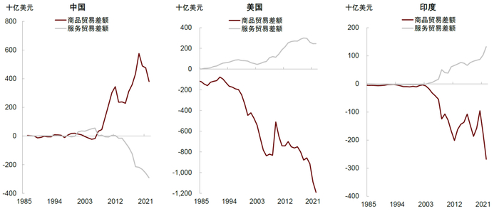 印度经济增长主要由服务业拉动——服务业对印度GDP贡献了较大比例[6]。从对外贸易的比较优势看,印度和美国的贸易结构较相近,服务贸易处于顺差而商品贸易呈现逆差。