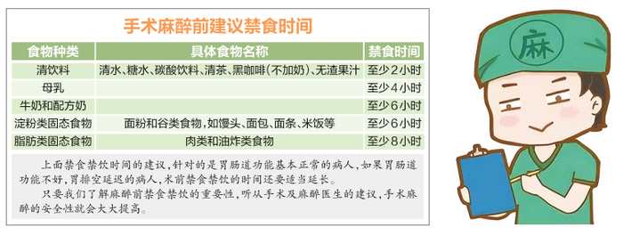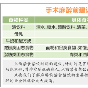 我们先来了解一下什么是麻醉。麻醉(anesthesia)指用药物或其他方法,使病人整个机体或机体的一部分暂时失去感觉以达到无痛的目的。择期手术中,除用局麻进行的小手术外,不论采用何种麻醉方式,均需常规排空胃,因为在正常情况下,人体食管和胃部相连的部位就是食道下段括约肌,它能够像个闸门一样避免胃内的胃酸和食物反流到食道和口腔。在手术麻醉状态下,患者机体的各种保护性反射,如吞咽反射、咳嗽反射等都会受到麻醉药物抑制作用,从而导致食管下段括约肌的“闸门”作用失效,胃内容物极易反流至食道、口腔甚至随着呼吸反流到气道。正常情况下,清醒的患者会直接将口腔内的胃内容物吐出体外或通过咳嗽反射,将气道内的异物清除出来。但在手术麻醉状态下,患者的吞咽反射、咳嗽反射受到抑制,机体的这种保护性的机制没办法发挥作用,再加上麻醉药物对消化系统以及手术操作对内脏脏器不良刺激等影响,术中术后极易出现恶心、呕吐,甚至胃内容物误吸到呼吸道,轻者出现吸入性肺炎,重者阻塞气道而引起窒息,危及生命安全。因此,麻醉前的一段时间禁食禁饮有助于促进胃排空,减少麻醉后食物反流误吸,对手术麻醉的安全起到重要的作用。