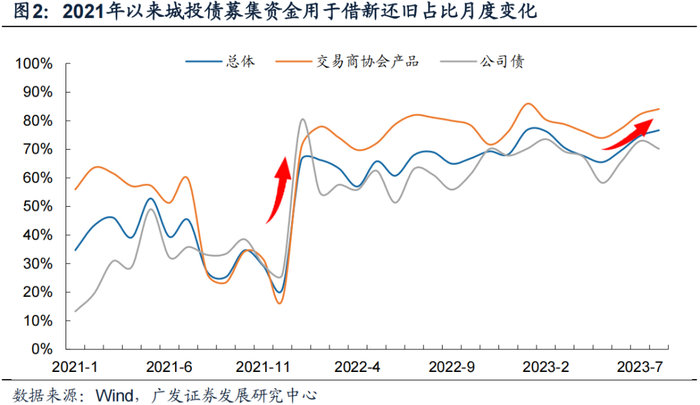 为了观测政策实际执行情况,我们统计了2021年1月1日-2023年8月31日发行的城投债募集资金用途数据,其中剔除了PPN,因为无法从公开市场中获取募集说明书。2022年初以来,城投债募集资金用于借新还旧的占比明显提升,绝大部分月份在60%-70%,而2021年借新还旧平均占比在36%左右。并且由于2022年交易商协会窗口指导收紧,协会产品用于借新还旧的占比升至76%,明显高于公司债的61%。