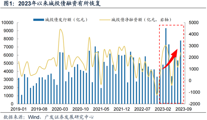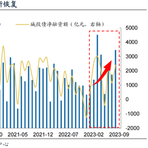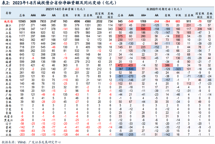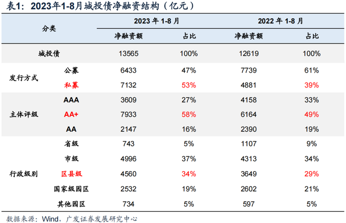 从内部结构看,私募债、AA+和区县级城投债净融资恢复更为明显。2023年1-8月,私募债净融资7132亿元,较2022年同期增长46.1%,占比从39%升至53%。AA+城投债净融资7933亿元,同比增长28.7%,占比从49%升至58%。区县级城投债净融资4560亿元,同比增长25%,并且占比上升5个百分点至34%。