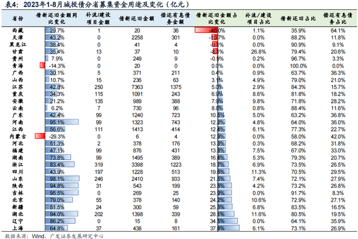 2023年1-8月多数省份发行城投债主要用于借新还旧,并且占比相较去年同期进一步上升。具体来看,除西藏、内蒙古、广东、广西、河南、辽宁、福建、河北外,各省用于借新还旧的占比均在70%以上。从借新还旧金额占比变化来看,仅西藏、天津、黑龙江、甘肃、贵州有所下降,其中西藏和天津降幅超过10个百分点。
