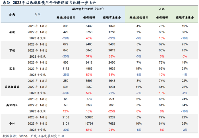 2023年1-8月,城投债用于借新还旧、偿还有息债务的发行规模相较2022年同期明显扩大,同比增幅达55%和21%,而用于补流/项目建设的发行规模同比下降30%。从发行规模占比来看,城投债用于借新还旧的占比同比提升8个百分点,从64%升至72%,用于补流/项目建设、偿还有息债务占比则分别下降5个、3个百分点。